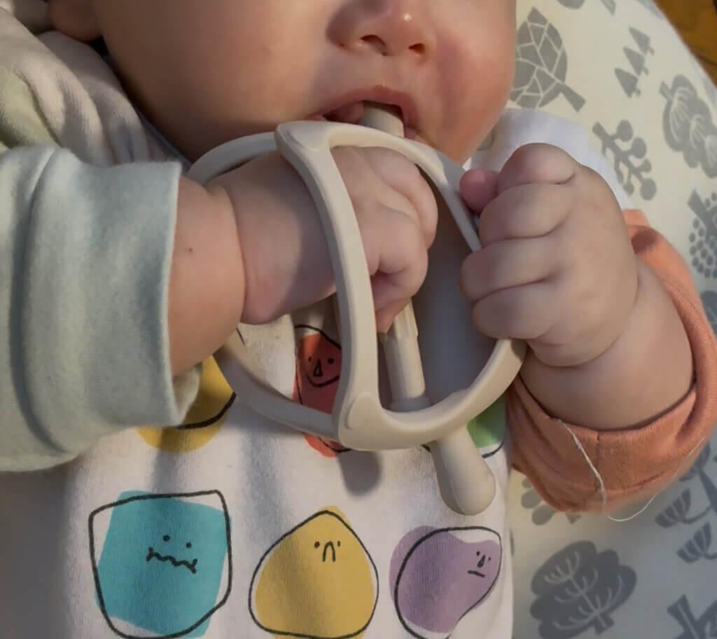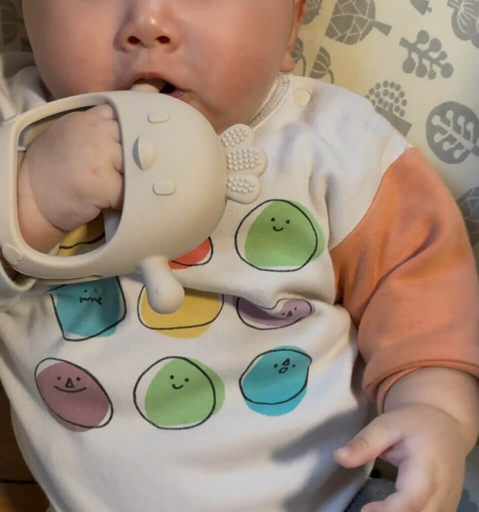 生後3か月あたりからよだれが大量に出るようになり、自分の指を舐めては上手に咥えられず泣くことが頻回に・・・。机やママの手など、近くにあるものをすぐに口へ持っていき、歯茎でかみかみする仕草が増えてきたので、歯固めに挑戦しました。